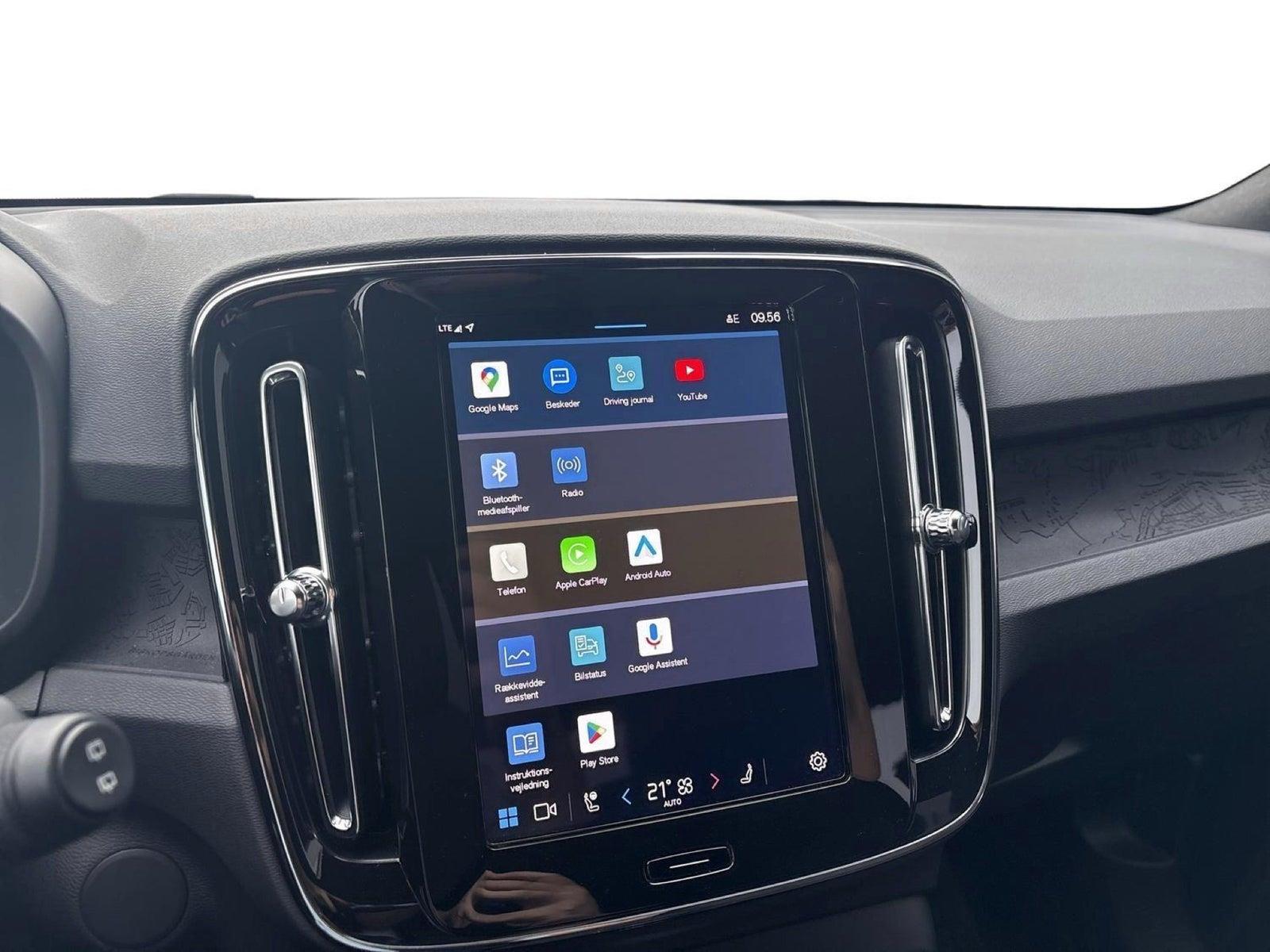 Andet udstyr: 12V stik for, Alarm m/bevægelsessensor, Armlæn for Aut. nedblænd bak/sidespejle, Automatisk bremsning efter kollision, Automatisk klimakontrol, Automatisk oplåsning af døre ved kollision, Barnelås fra instrumentbord, Cruise control, Digital Key, Driver Alert Control, Driver Assistance, Driver Awareness, Dæk reparations kit, Elektrisk kabinevarmer (ReCh), Hig Voltage (HVHA), Elektronisk parkeringsbremse. El-indfældbare sidespejle. El-justerbar lændestøtte ved forstole, 4-vejs. El-styret bagklap. Forlygtespulere. Færdselstavlegenkendelse. Gearknop i læder med kontrastsyning Google Automative Services (GAS). Hill Descent control. Hill start assist. Home safe LED-belysning, Isofix bag (ydre pladser), Ladekabel type 2, mode 3, 3-faset 16A, Lane Keeping Aid, LED kørelys, Thors Hammer Led-lys Active High Beam inkl. aut. op- og nedbl. af fjernlys - LED forlygter m. ABL og AHB, Låsbare hjulbolte, Nøglefribetjening, døre/start, Oncoming Lane Mitigation, Opbevaringsrum under kølerhjelm (31L), Opvarmet rat, Parkeringshjælp for & bag, Bak-kamera, Regnsensor, Sort loftbeklædning, Trådløs opladning af mobiltlf, Varmepumpe, Volvo On Call